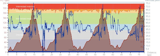 Datos: 83,5Kms, en 2h15' a 172ppm. Ascendidos 775metros. 17ºC.